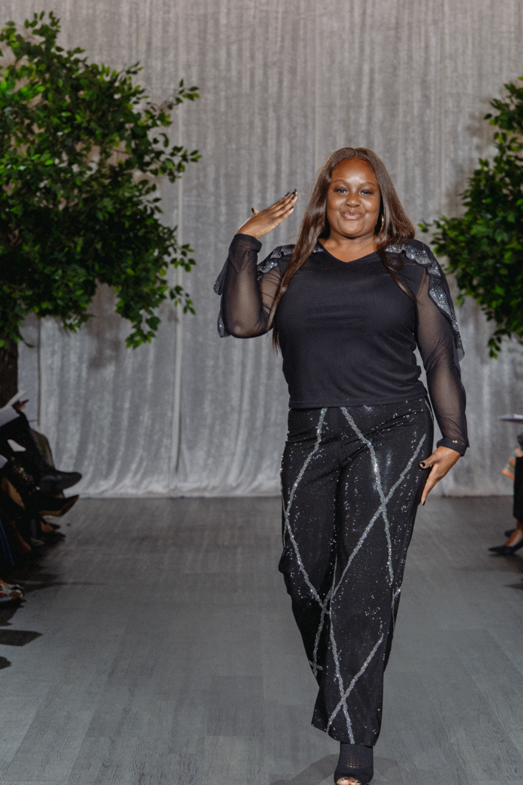 Step into the spotlight with the Crystal Web Trousers, where sleek sophistication meets radiant sparkle. Designed in jet-black with a fluid drape, these trousers are illuminated by an intricate diamond-lattice of shimmering crystals that catch the light with every move.