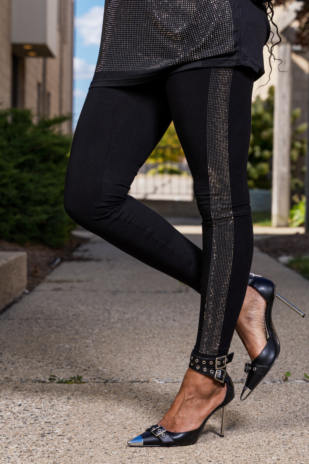 Polished, sleek, and designed to shine—our Crystal Tux Legging takes everyday black leggings and dresses them up with a tuxedo-inspired stripe of sparkling charcoal crystals down each side. The slimming silhouette hugs in all the right places while the subtle shimmer elongates the leg, giving you that effortless “from desk to dinner” vibe.