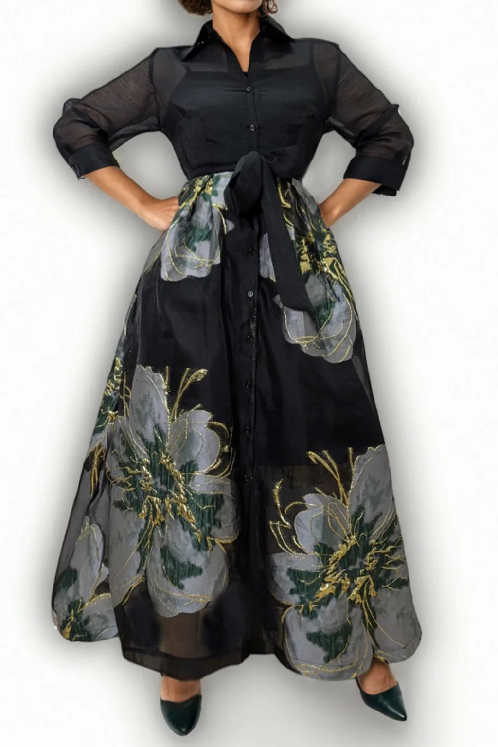 The semi-sheer button-front bodice with collared neckline gives it structure, while the flowing maxi skirt cascades with dramatic elegance. The metallic blooms catch every angle of light, making this a perfect look for evenings, special occasions, or when you simply want to glow with irresistible confidence.