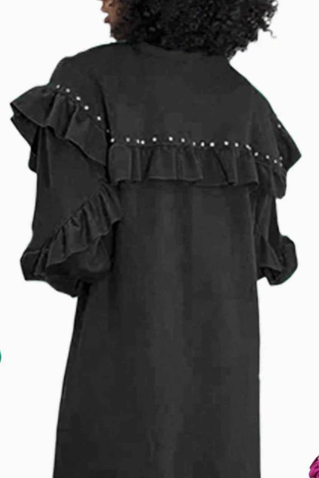 Turn up the volume on everyday chic with our Ruffle Edge Glow Dress. Designed in a soft, fluid knit, this standout piece is trimmed with cascading ruffles edged in bold metal nailhead studs for just the right touch of shine. The relaxed shift silhouette makes it effortless to wear, while the statement shoulders and sleeve ruffles bring a modern, fashion-forward edge.