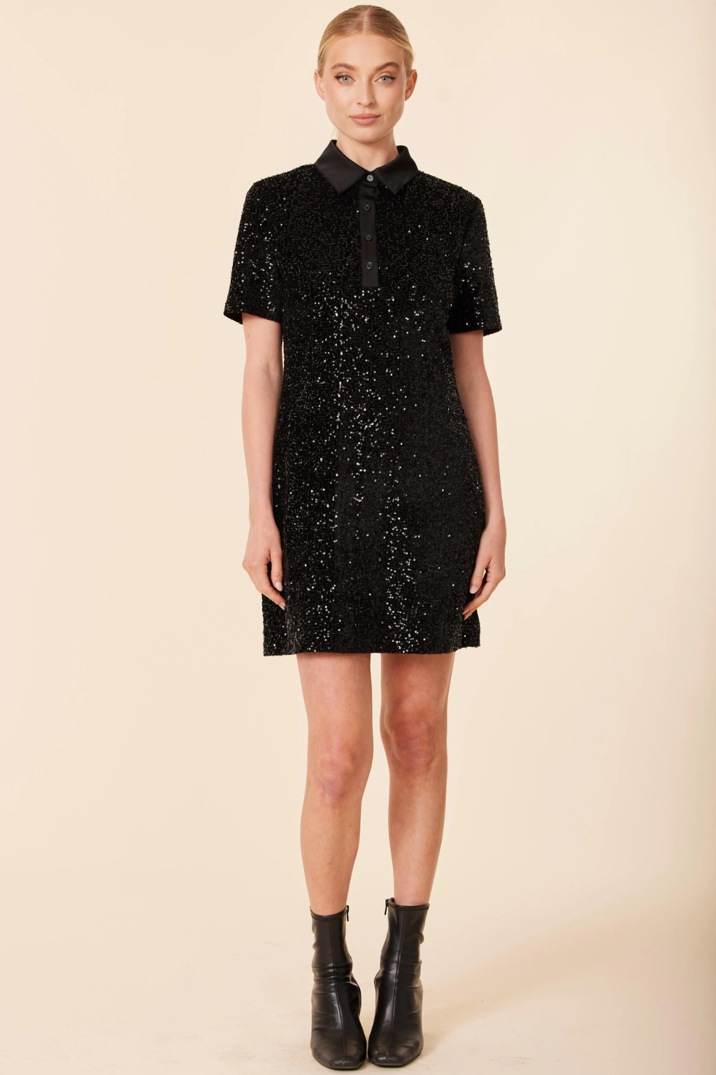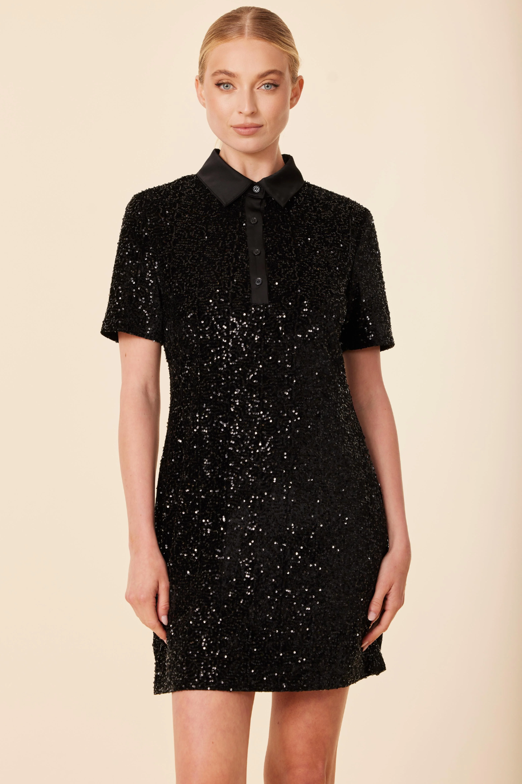 When the night calls, this dress answers. The City Lights Mini shines with all-over black sequins that catch every glimmer, echoing the sparkle of downtown streets after dark. A sleek satin collar and short sleeves add a tailored twist to the shimmer, giving this mini just the right mix of polish and play.