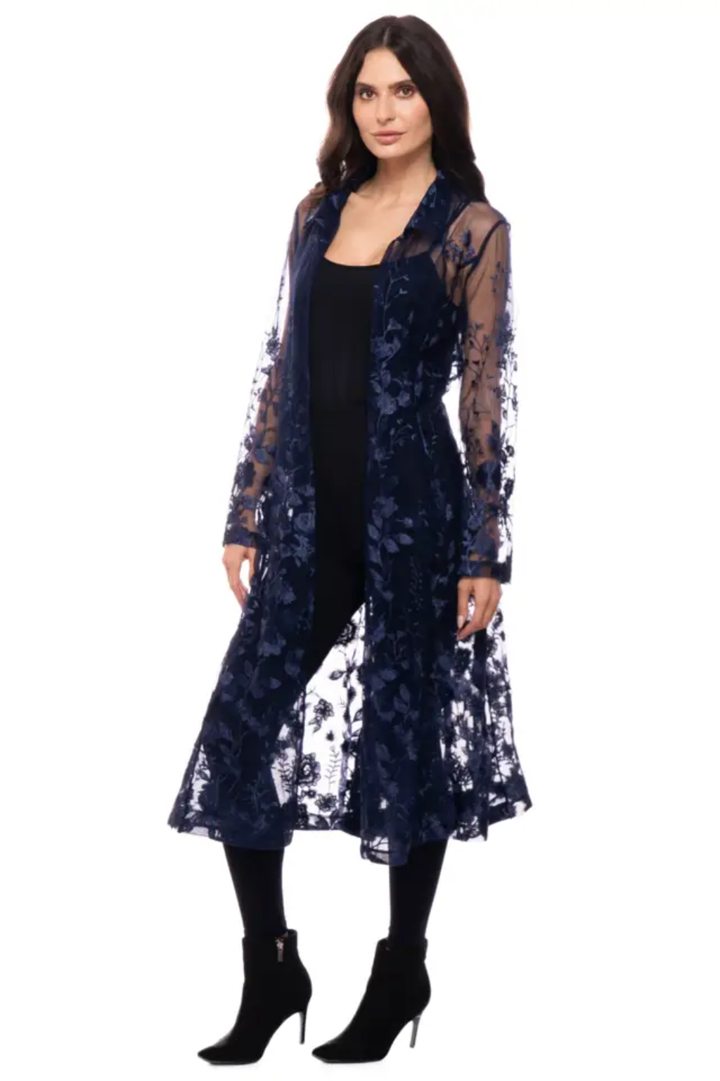 Float into the room with effortless drama in our Sapphire Petal Sheer Duster—a stunning navy mesh layering piece detailed with tone-on-tone floral embroidery for that rich, luxe finish. Lightweight, flowy, and beautifully sheer, it adds instant elegance over denim, dresses, or an all-black fit. The soft drape and long silhouette give you that “walk-in-and-own-it” energy while still feeling airy and easy to wear.