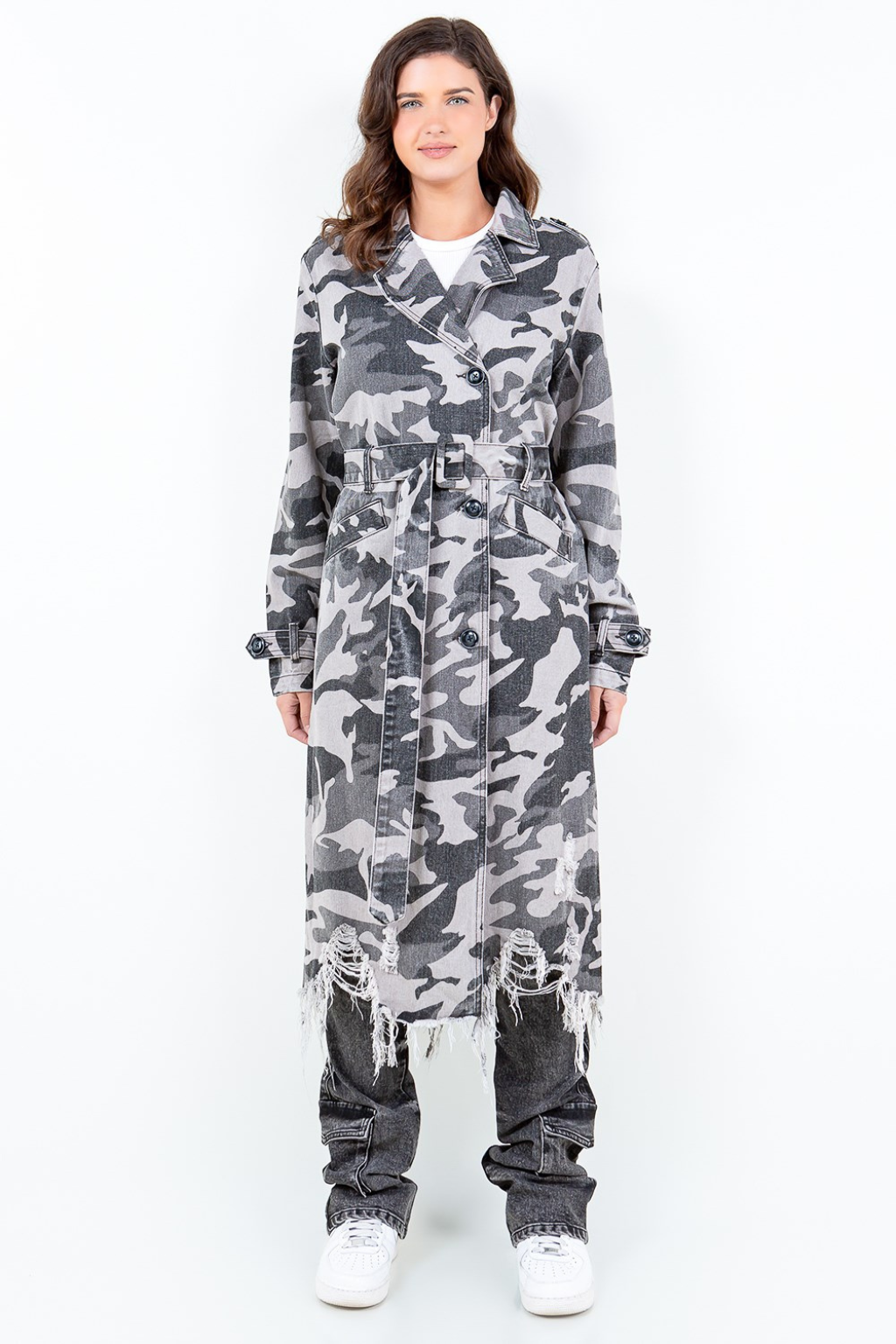 Designed with epaulet shoulders, a notched lapel, and button-cuff sleeves, it channels a modern utility vibe, while the frayed hemline adds a raw, rebellious finish. The muted grey-tone camouflage makes it the perfect neutral layer to pair with anything from joggers to coated denim.