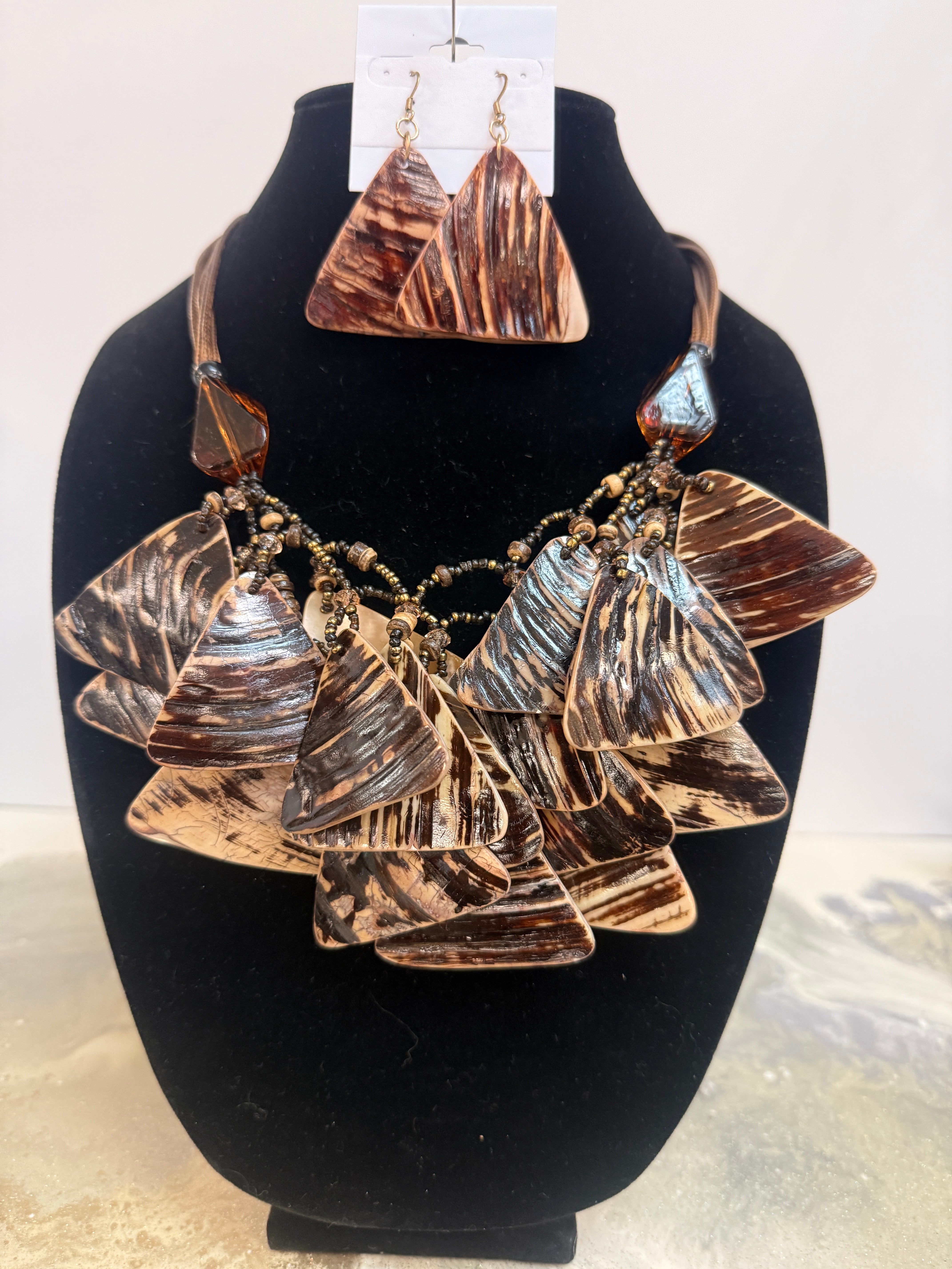 The Tortoise Tide Statement Set features layered triangular shell-inspired pieces in rich marbled tones of espresso, caramel, and sand. Each element has natural striations and texture, giving the set an organic, sculptural feel. The dramatic clustered necklace sits beautifully at the collarbone, creating instant impact, while the coordinating drop earrings echo the same striking shape for a perfectly balanced look.