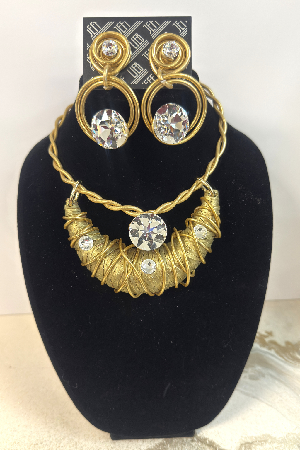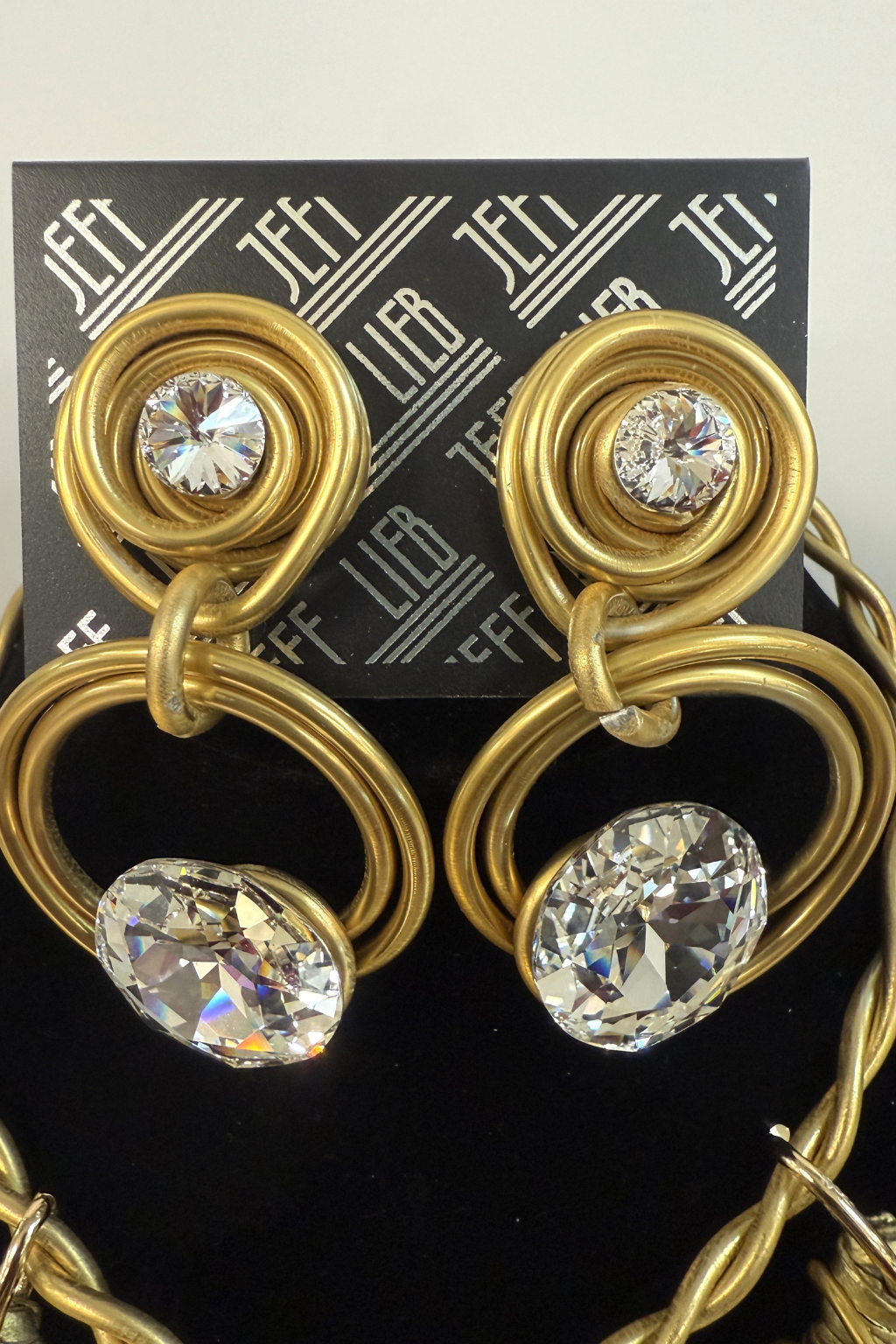 Step into the glow of unapologetic luxury with the Crescent Gold Radiance Set, a breathtaking Jeff Lieb custom creation wrapped in rich, hand-sculpted gold wire and finished with brilliant Swarovski crystals.