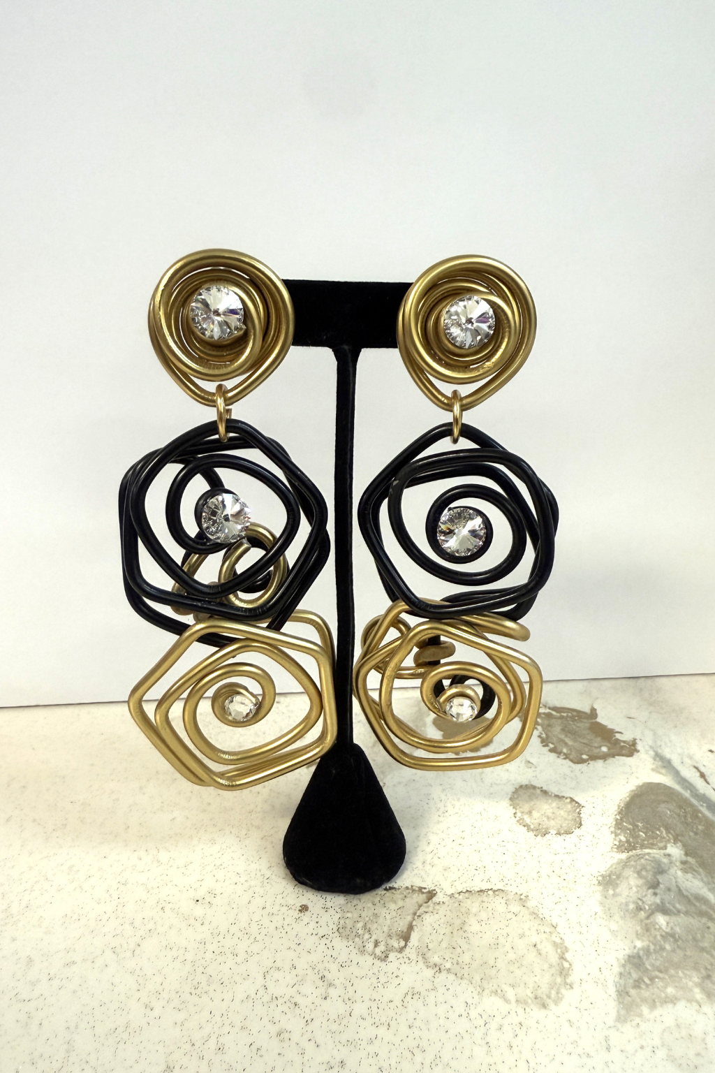 Each pair begins with a polished spiral clip top, crowned with a brilliant Swarovski crystal that sets the tone for the radiance below. The design then flows into interlocking sculptural shapes — a striking mix of swirling coils and angular contours in dual colors — creating depth, movement, and high-impact visual drama.