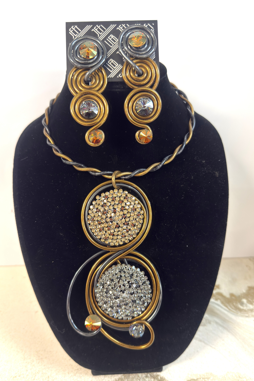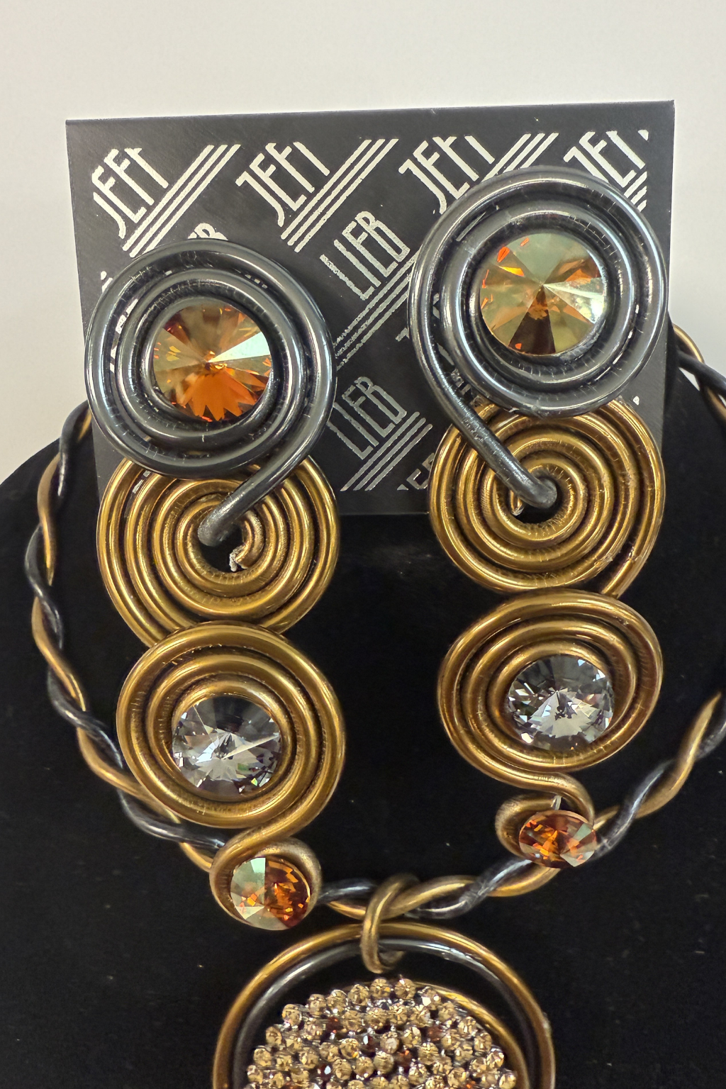 The Eternal Eclipse Radiance Set is a breathtaking fusion of sculptural metalwork and Swarovski brilliance — an unmistakable Jeff Lieb masterpiece. Designed in rich antique gold and charcoal wire, this set captures the drama of two luminous spheres orbiting in perfect harmony, echoing the elegance of an eclipse in motion.