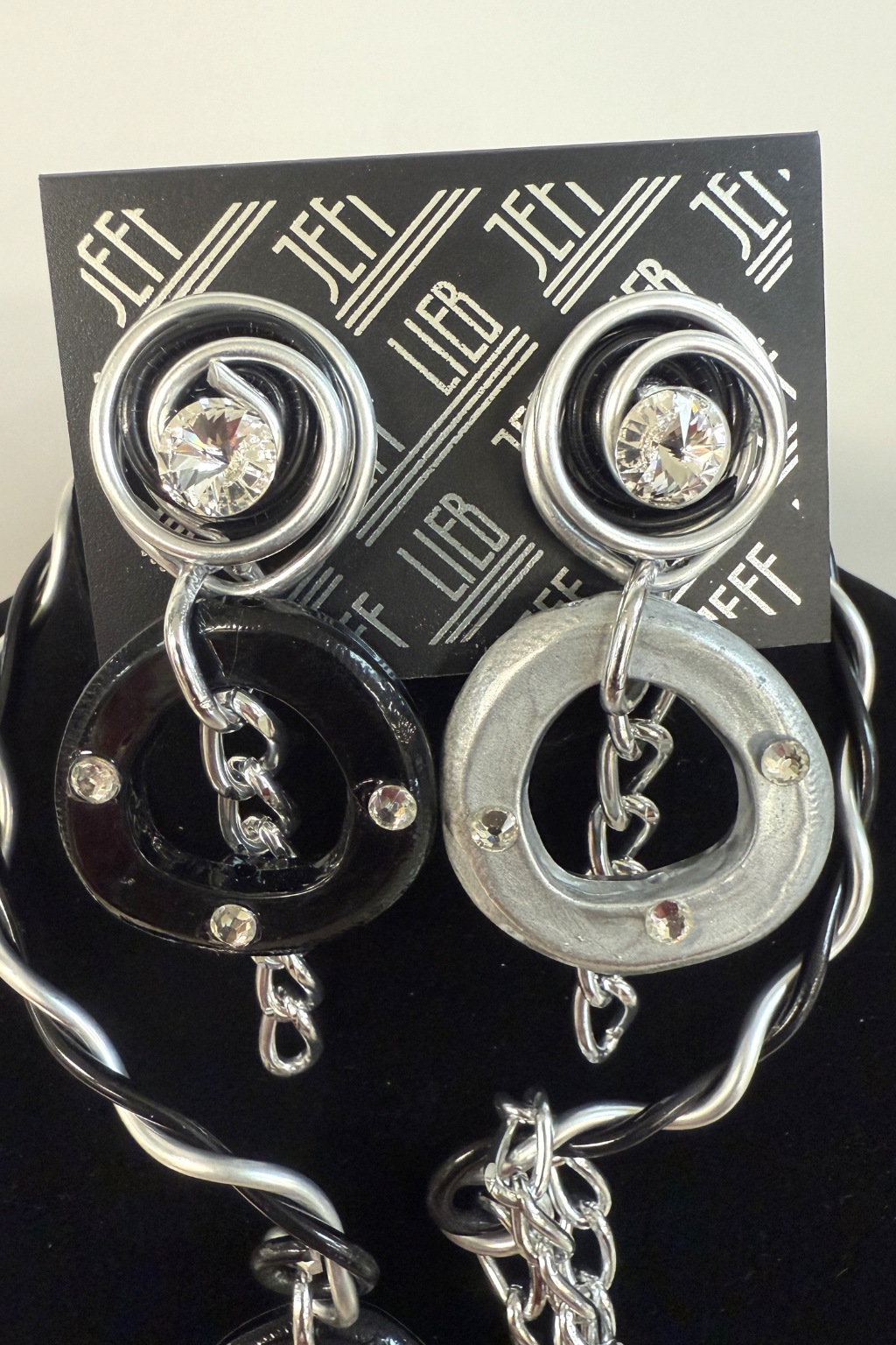 The Chain Reaction Couture Set is a bold fusion of modern artistry and industrial glam. Hand-sculpted by designer Jeff Lieb, this custom ensemble pairs swirling aluminum coils with cascading chain links and striking two-tone metal elements for a look that’s unapologetically fashion-forward.