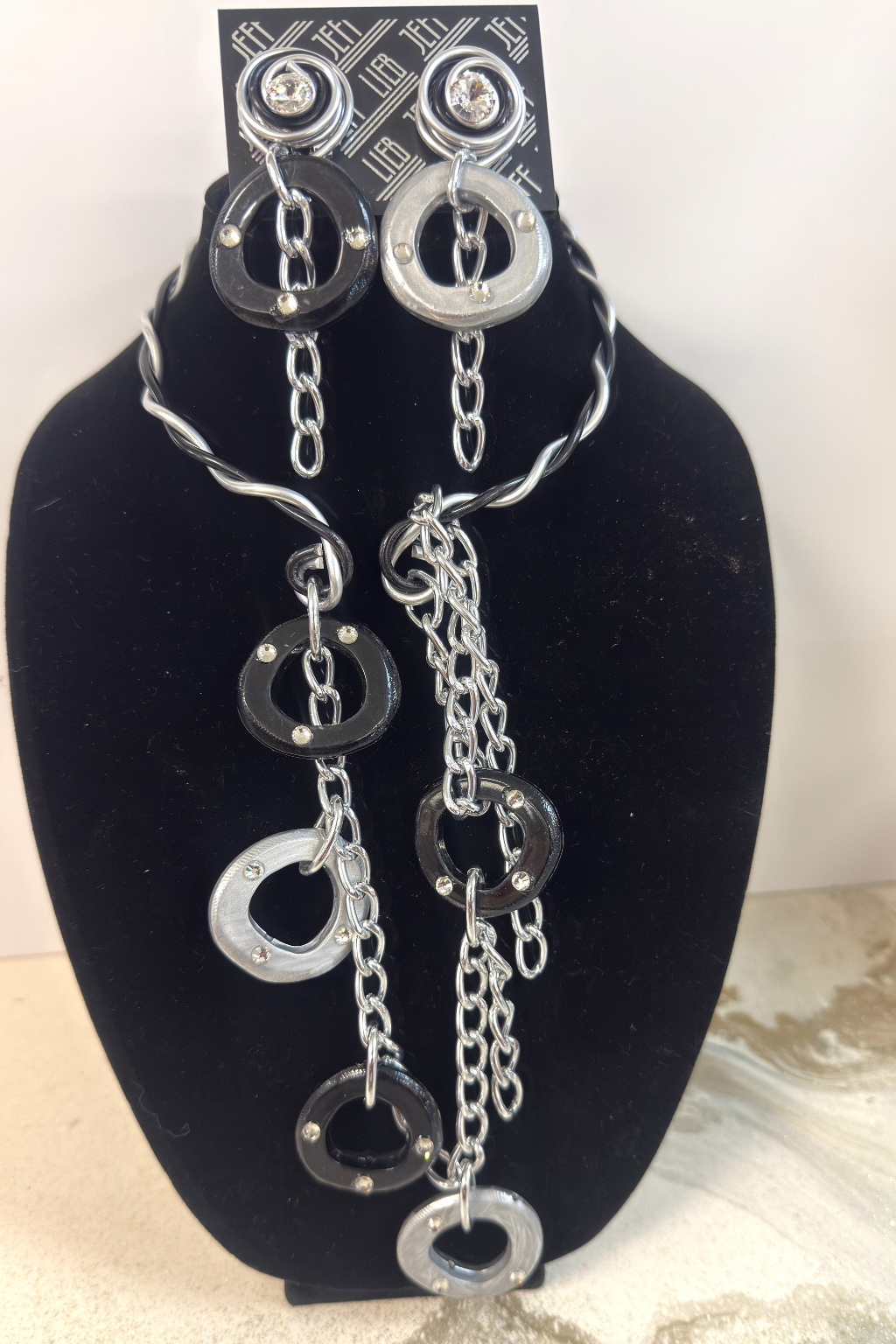 Each circular form is accented with brilliant Swarovski crystals, catching the light with every move and elevating the edgy silhouette with a touch of luxe sparkle. The mixed black-and-silver palette gives the set a dynamic, urban-chic vibe — powerful, sculptural, and impossible to ignore.
