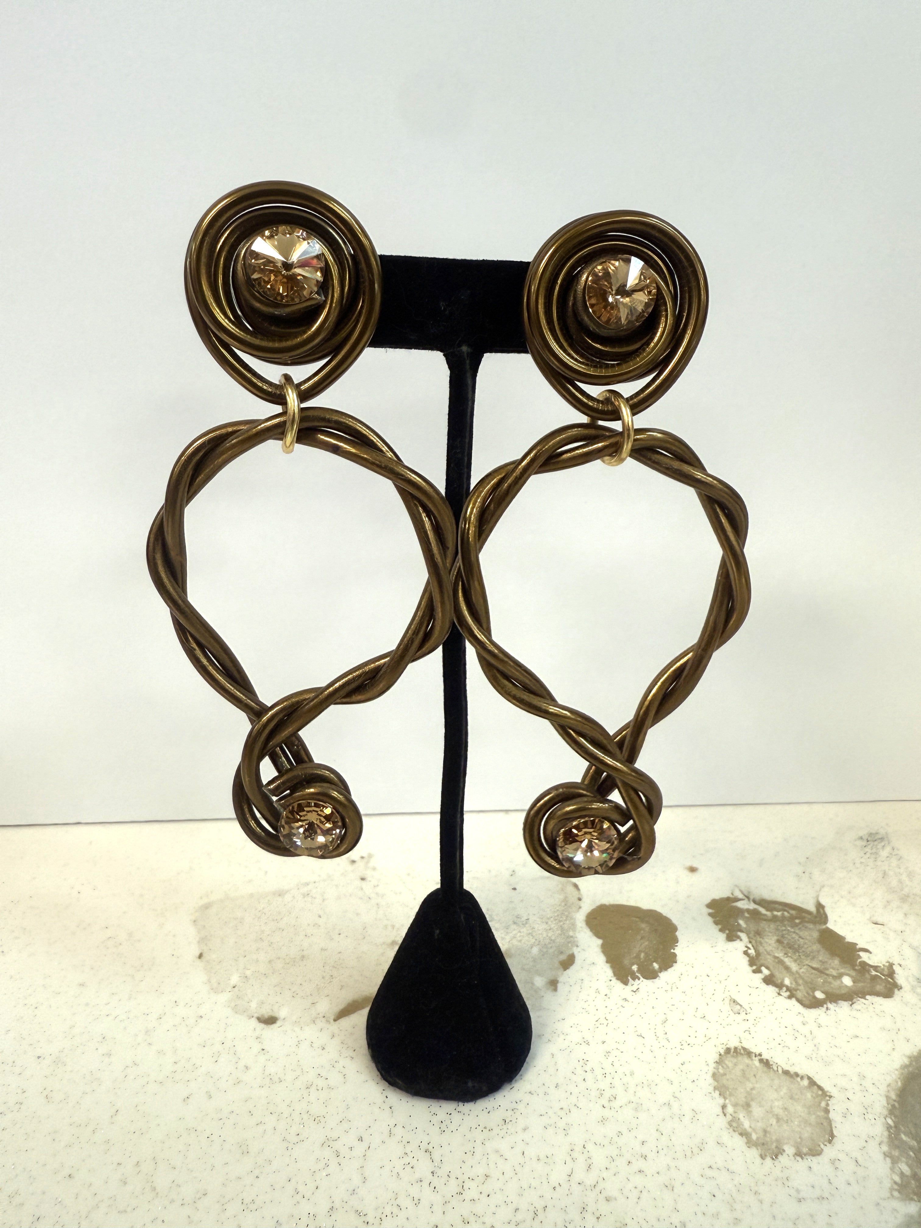 Each earring begins with a dimensional halo top, formed from hand-twisted metallic coils that create a modern, circular crown around a brilliant Swarovski crystal. The design flows into a bold open-loop silhouette, crafted from intertwining twisted metal that adds movement, texture, and architectural drama.