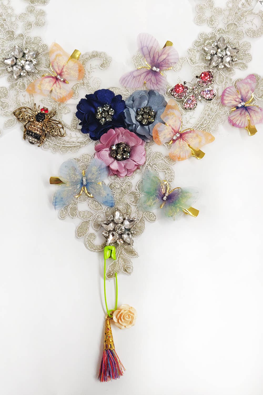 *Lace trim embellished floral crystal brooches necklace, closure with antique gold chain & lobster claw clasp * Metallic *