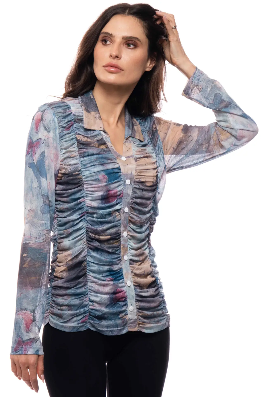 The Watercolor Mirage Top is a flattering ruched mesh blouse designed to sculpt and elevate your everyday style. Featuring an abstract watercolor-inspired print in blended shades of blue, taupe, charcoal, and soft blush, this piece feels like wearable art.