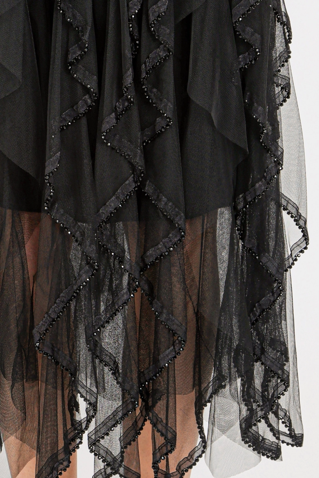 - Details: Sheer layered tulle with bead-trimmed ruffles