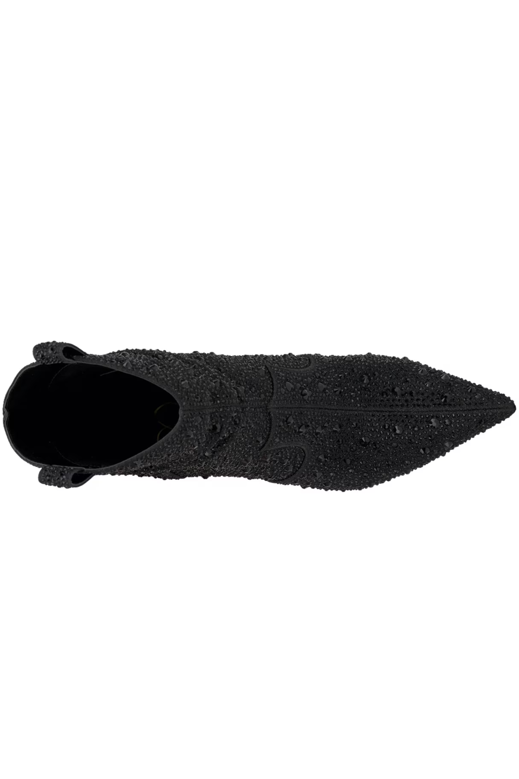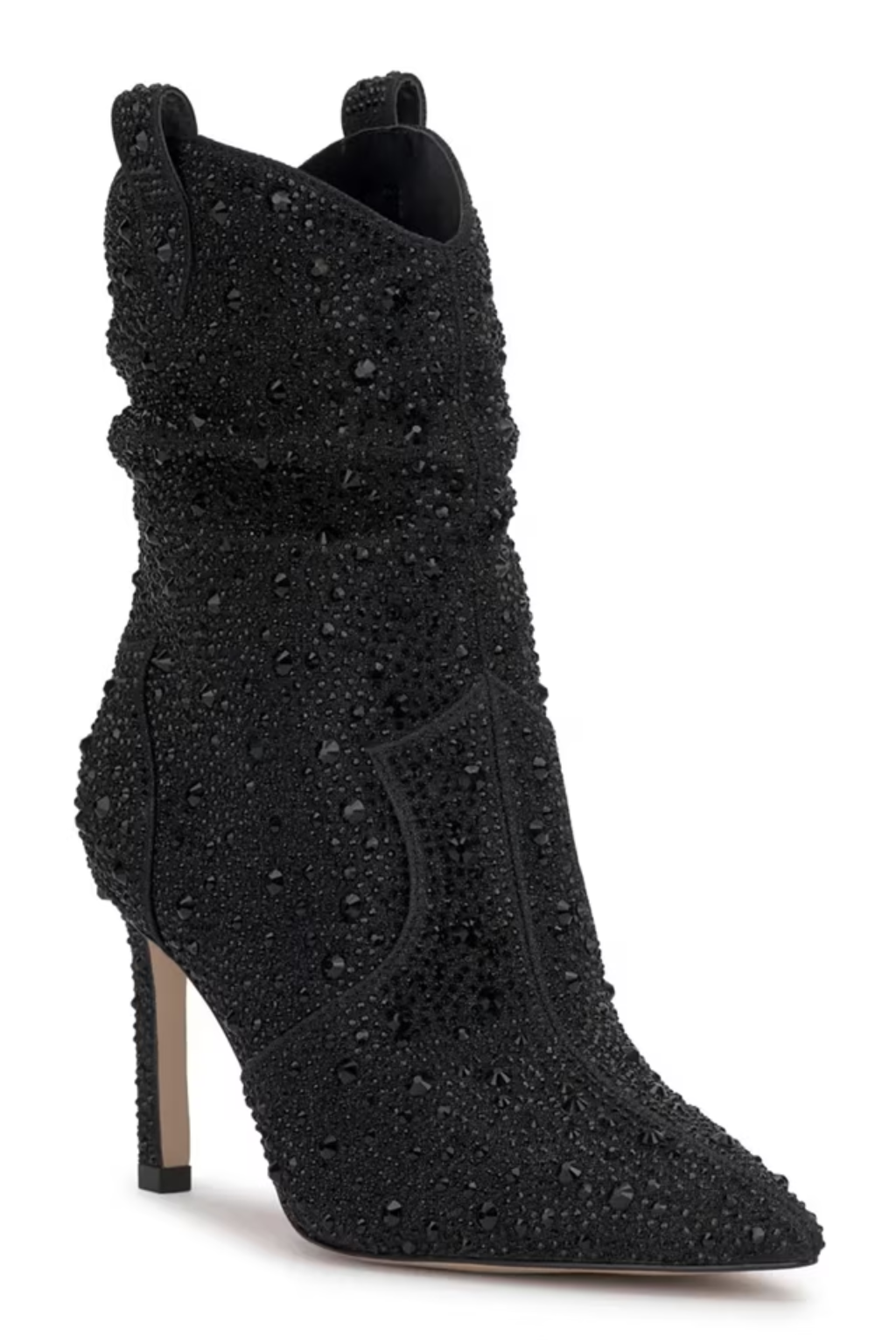Turn heads with this glam-meets-Western ankle boot, designed to make a bold statement. Featuring a pointed toe and sleek stiletto heel, this boot blends cowgirl charm with high-fashion flair. Covered in sparkling rhinestone embellishments, the design catches the light with every step. Pull tabs and Western-inspired stitching complete the look, making it the perfect choice for concerts, parties, or adding standout style to your everyday wardrobe.
