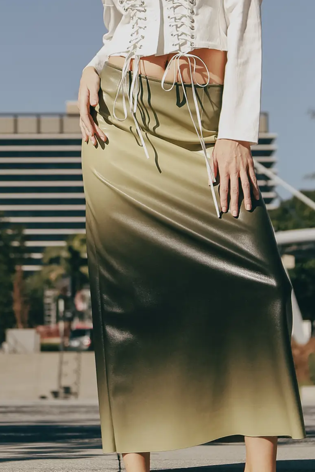 The Lime Mirage Skirt is where modern edge meets refined artistry. Crafted in supple vegan leather, this skirt makes a bold statement with its sleek silhouette and ombré design—radiant lime melting into rich black for a hypnotic gradient effect.