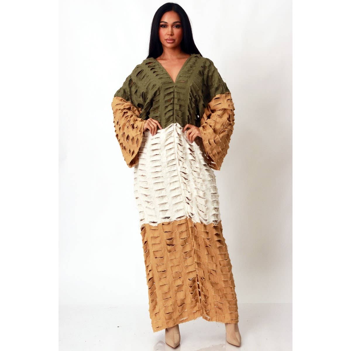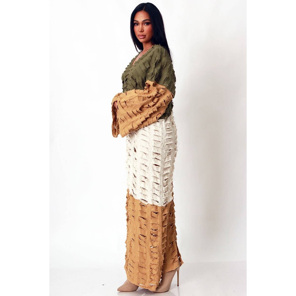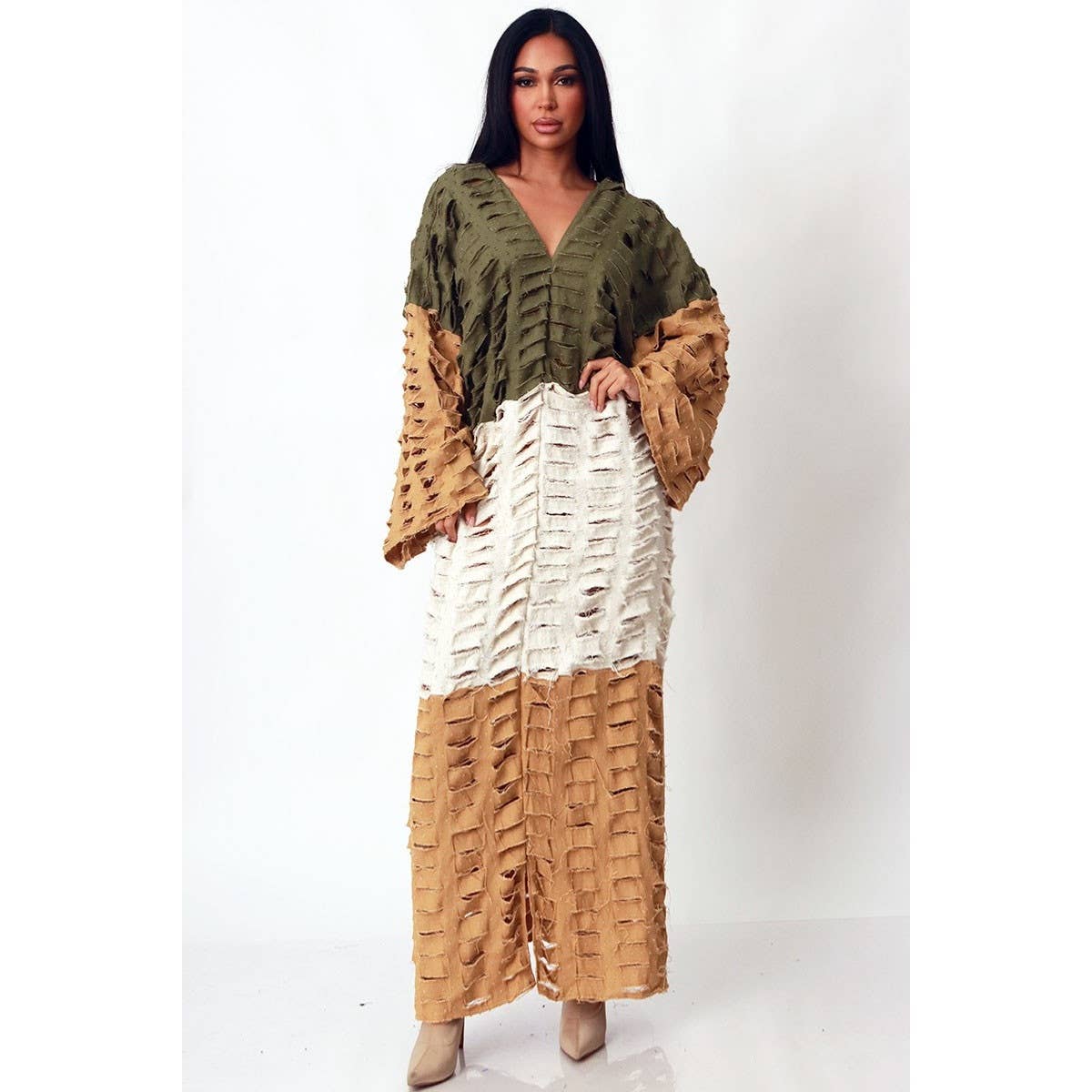 Bold, fluid, and artfully undone—the Motion Ripped Maxi is designed to move with confidence and intention. Featuring a flattering V-neckline and a striking color-block design in olive, cream, and taupe, this maxi dress stands out with its ripped, textured detailing that adds depth and dimensional edge throughout.