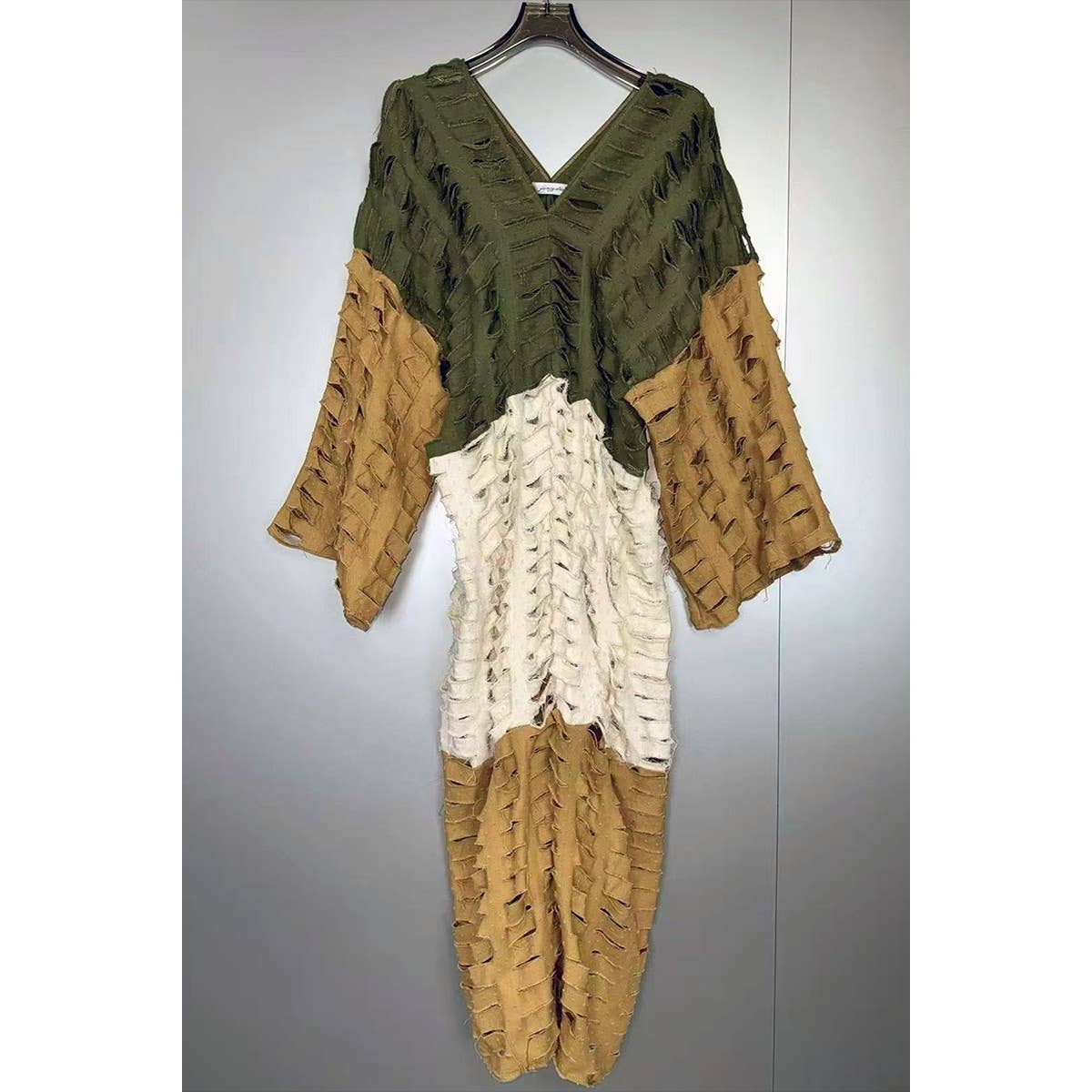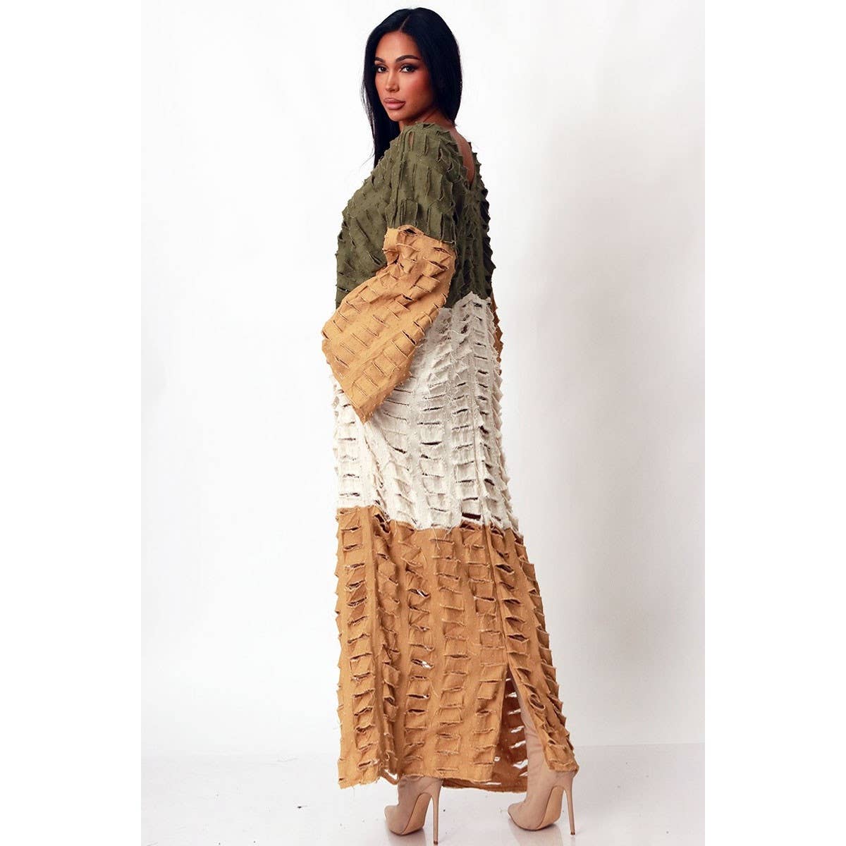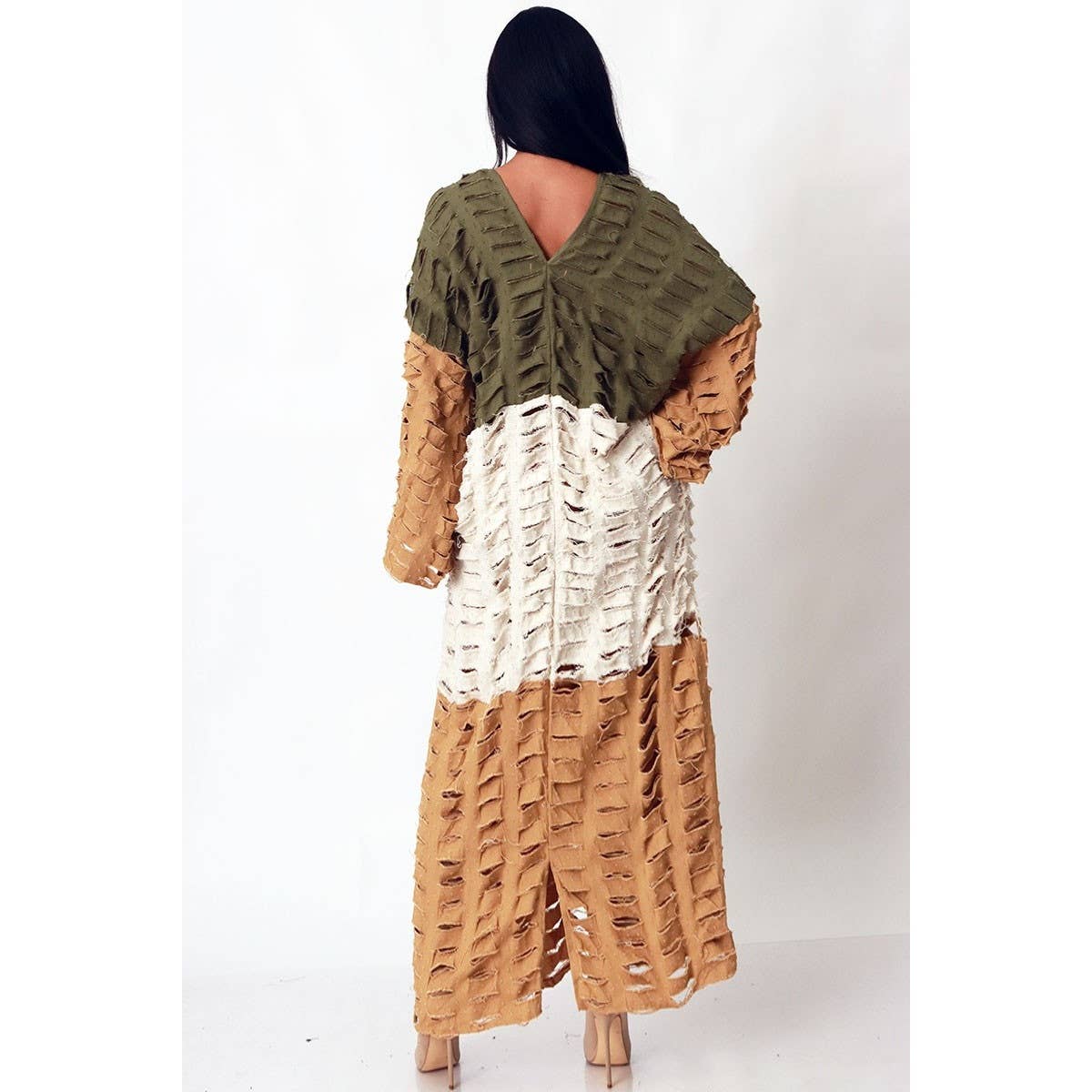 Bold, fluid, and artfully undone—the Motion Ripped Maxi is designed to move with confidence and intention. Featuring a flattering V-neckline and a striking color-block design in olive, cream, and taupe, this maxi dress stands out with its ripped, textured detailing that adds depth and dimensional edge throughout.