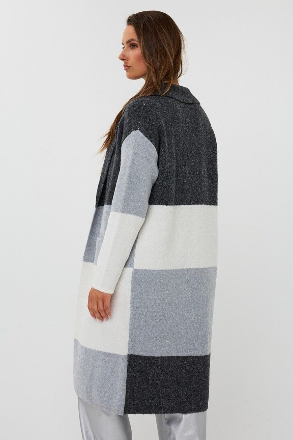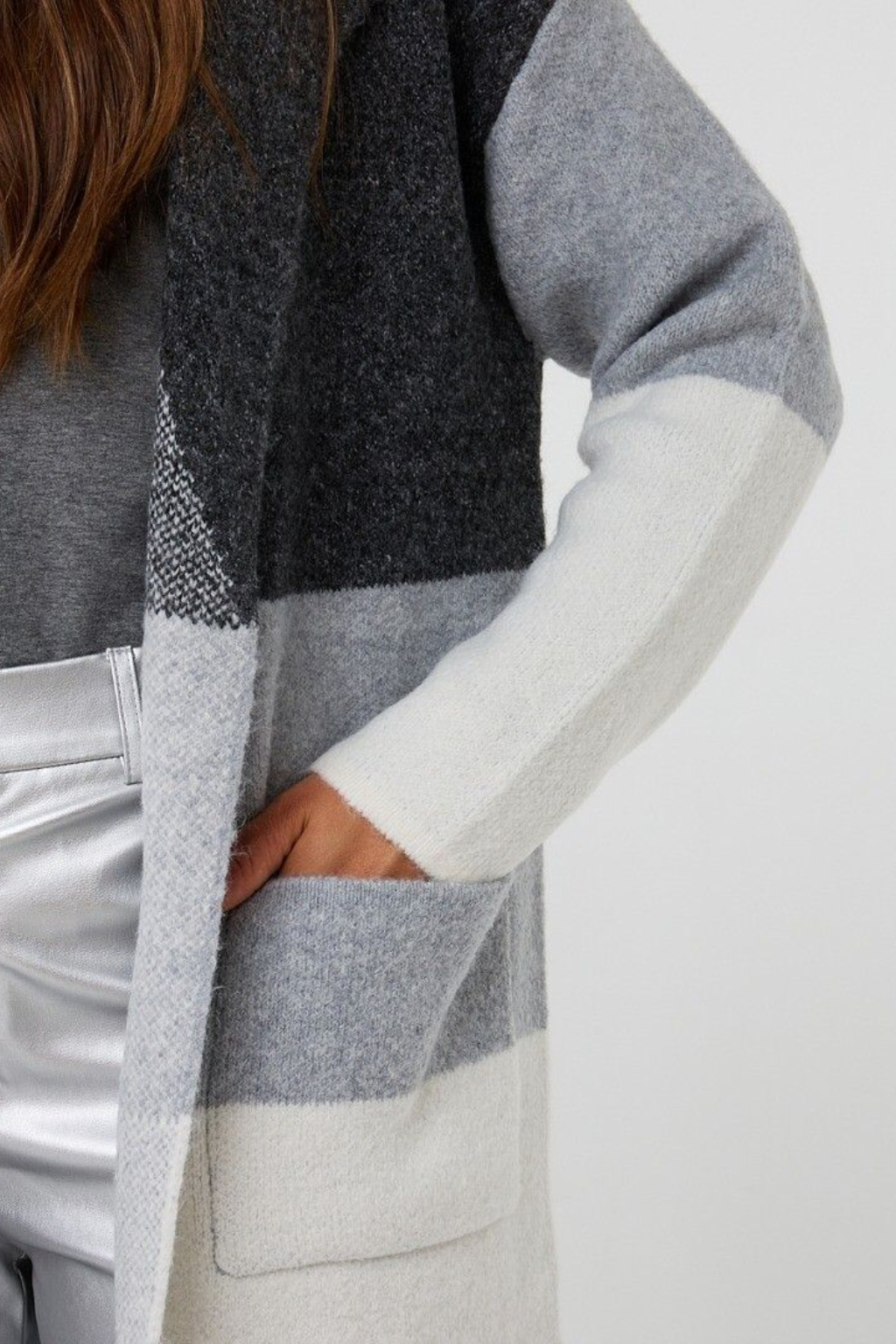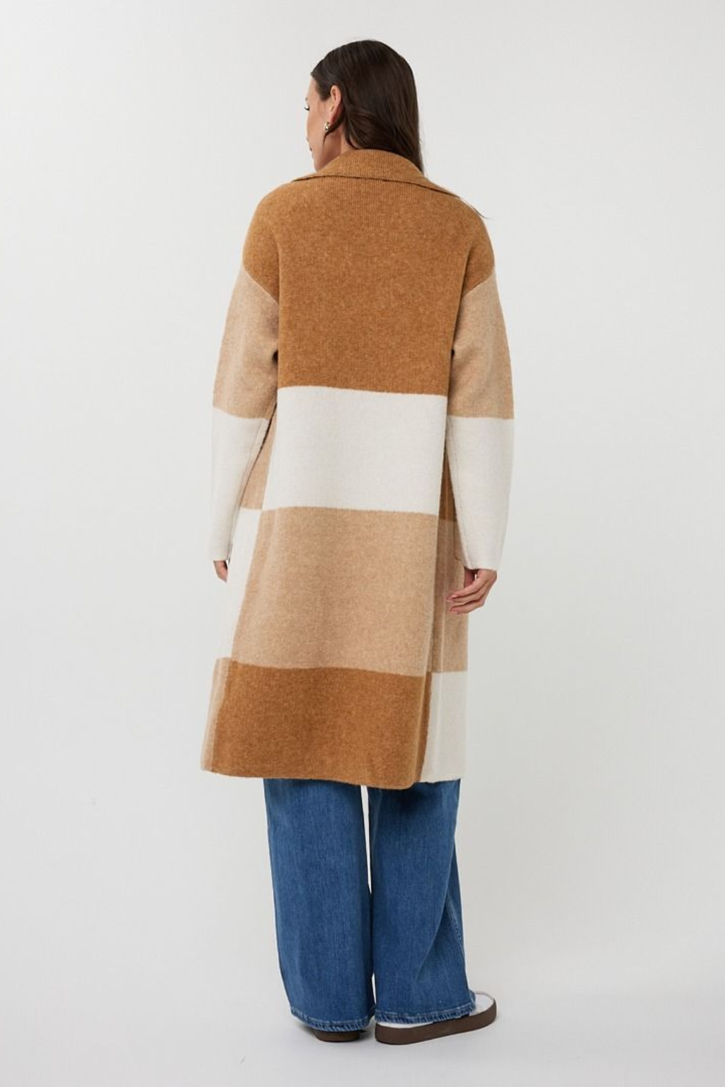 Wrap yourself in effortless sophistication with the Shadow Stripe Duster, where comfort meets modern edge. Its bold, color-blocked stripes in soft neutrals create a striking yet versatile look—perfect for layering through shifting seasons.
