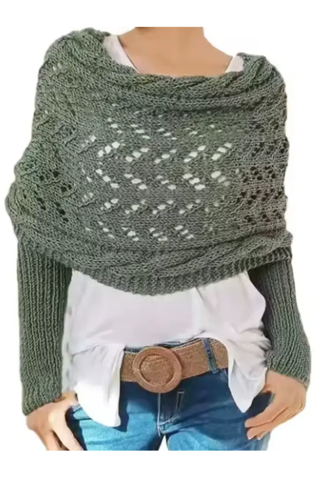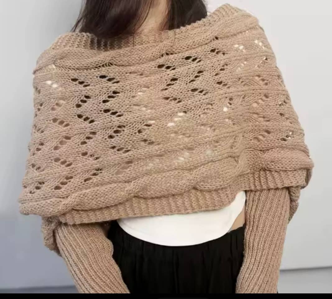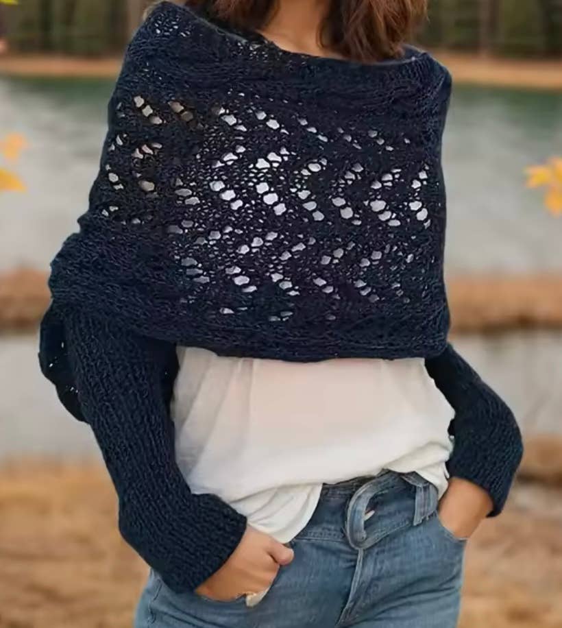 Effortlessly blending the elegance of a scarf with the coziness of a sweater, this knit essential is a wardrobe game-changer. Designed with an airy open-stitch pattern and ribbed sleeves, it drapes gracefully across the shoulders for a layered, wrapped look, without the fuss of adjusting. Perfect for chilly mornings or evenings out, it wears like a cozy cocoon yet looks polished enough for day-to-night styling. Pair it with jeans for casual charm, or layer over a dress for a luxe, modern finish. Available in multiple rich tones—from soft ivory to deep navy —this statement knit will be the piece you reach for again and again.