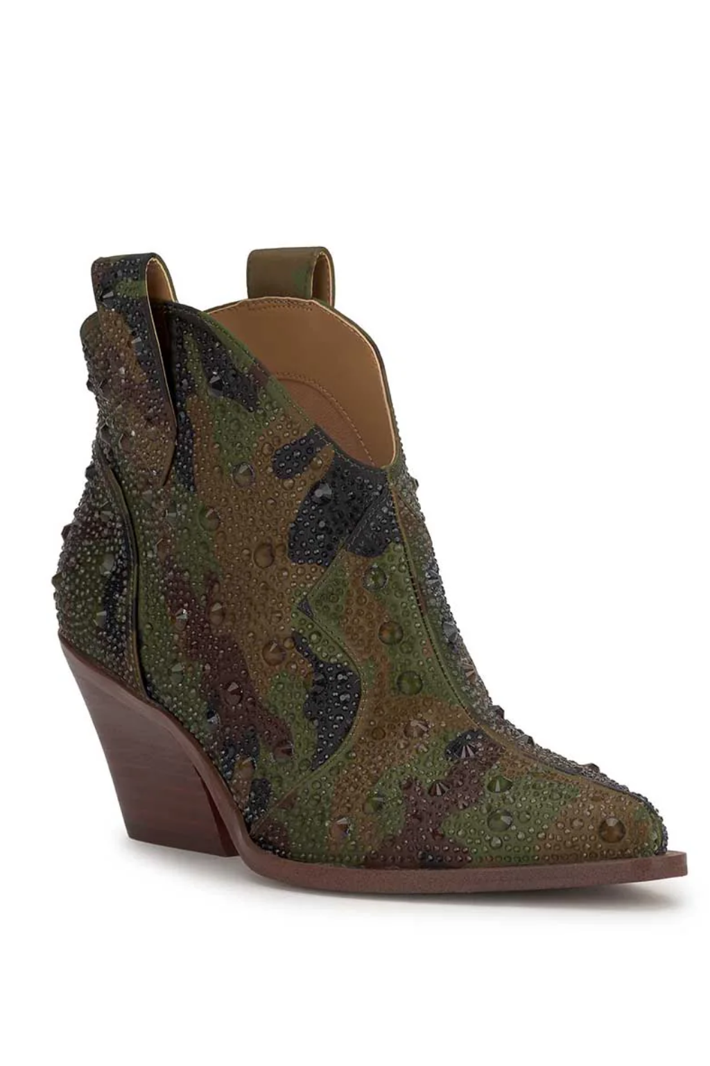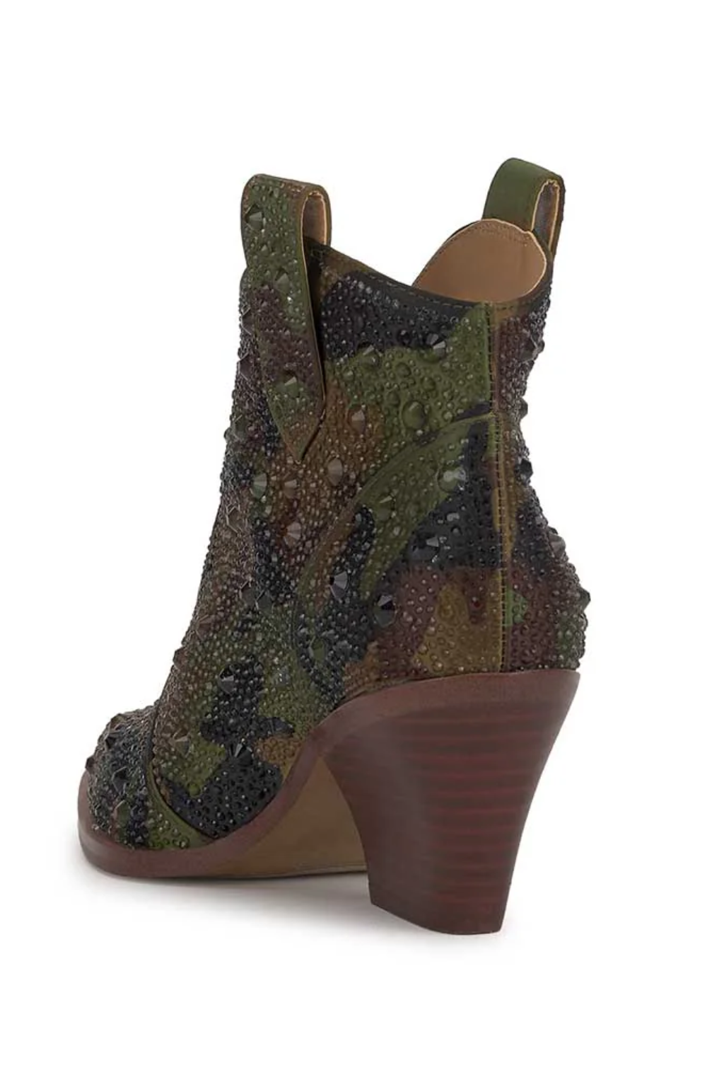 Make a bold statement with this rhinestone-studded Western-inspired ankle bootie. Designed with a pointed toe and angled stacked heel, this boot combines classic cowboy flair with glamorous edge. The upper is fully embellished with tonal crystal detailing for an eye-catching sparkle, while dual pull tabs offer easy slip-on convenience. Perfect for concerts, nights out, or adding a dazzling twist to everyday denim, this boot is the ultimate blend of rugged and radiant.