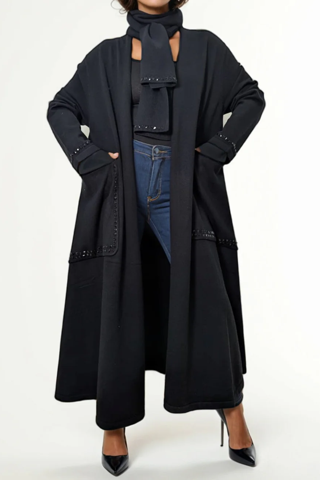 Wrap yourself in understated glamour with the Moonlit Whisper Duster. Designed in a sweeping maxi length, this black beauty moves with quiet elegance while subtle sparkles trace the pocket detail—like whispers of moonlight against the night sky. The open-front silhouette makes it effortless to layer over sleek dresses, tailored trousers, or even denim, elevating any look with a touch of mystique.