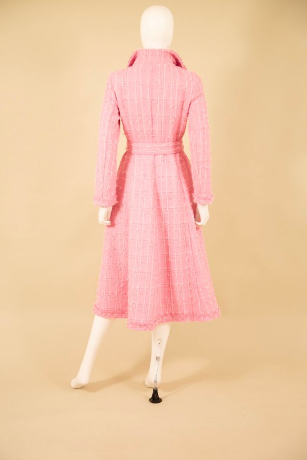 Crafted from a richly textured jacquard bouclé with tonal fringe detailing, this coat brings tactile luxury to life. The vibrant rosé hue injects a playful, romantic energy — perfect for standing out against winter’s grayscale palette. The fuzzy bouclé weave dances under light, offering subtle shimmer and visual interest.