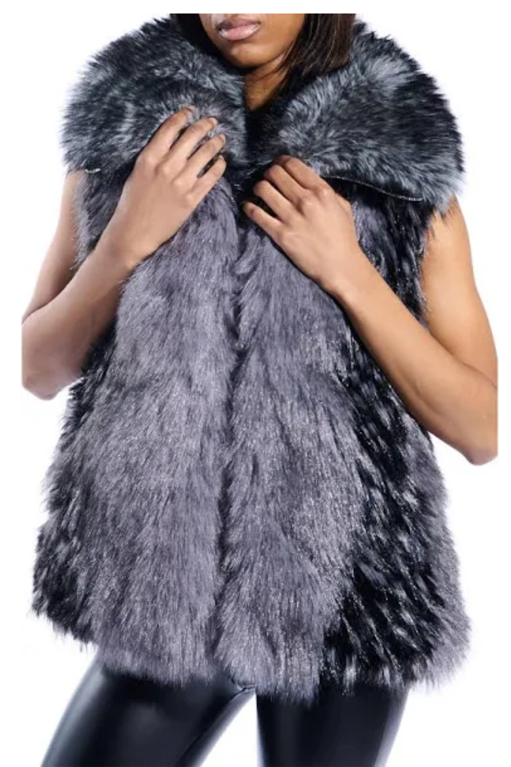 Embrace the power of chic with the Storm Luxe Vest, a statement layer that exudes elegance and edge. Designed in a rich storm-gray faux fur with contrasting jet-black accents, this vest delivers texture, drama, and warmth in one irresistible piece. The oversized collar frames your face with luxe softness, while the sleek zip-front design adds modern polish.