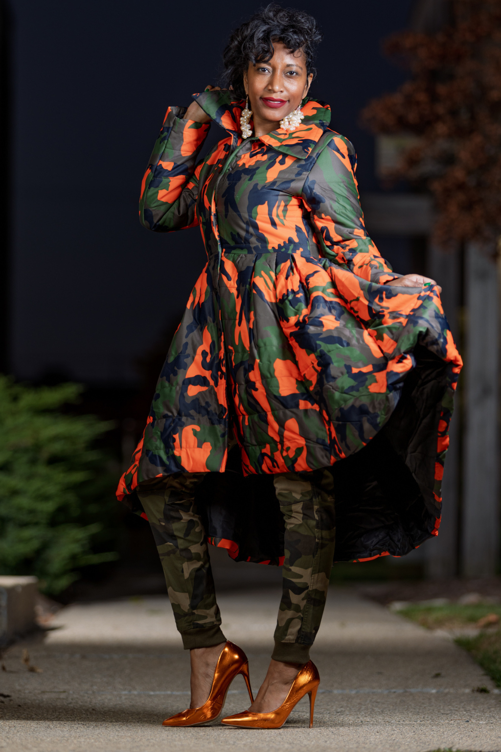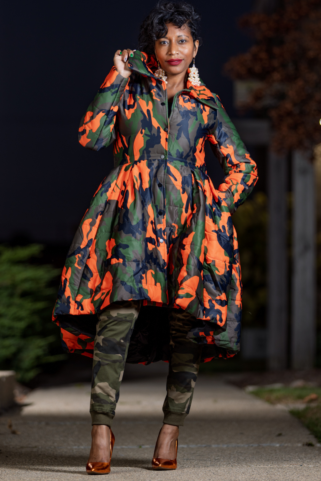 Available in classic camo with vivid blaze orange accents or sleek all-black for an understated edge, this coat transitions effortlessly from city strolls to boutique nights out.