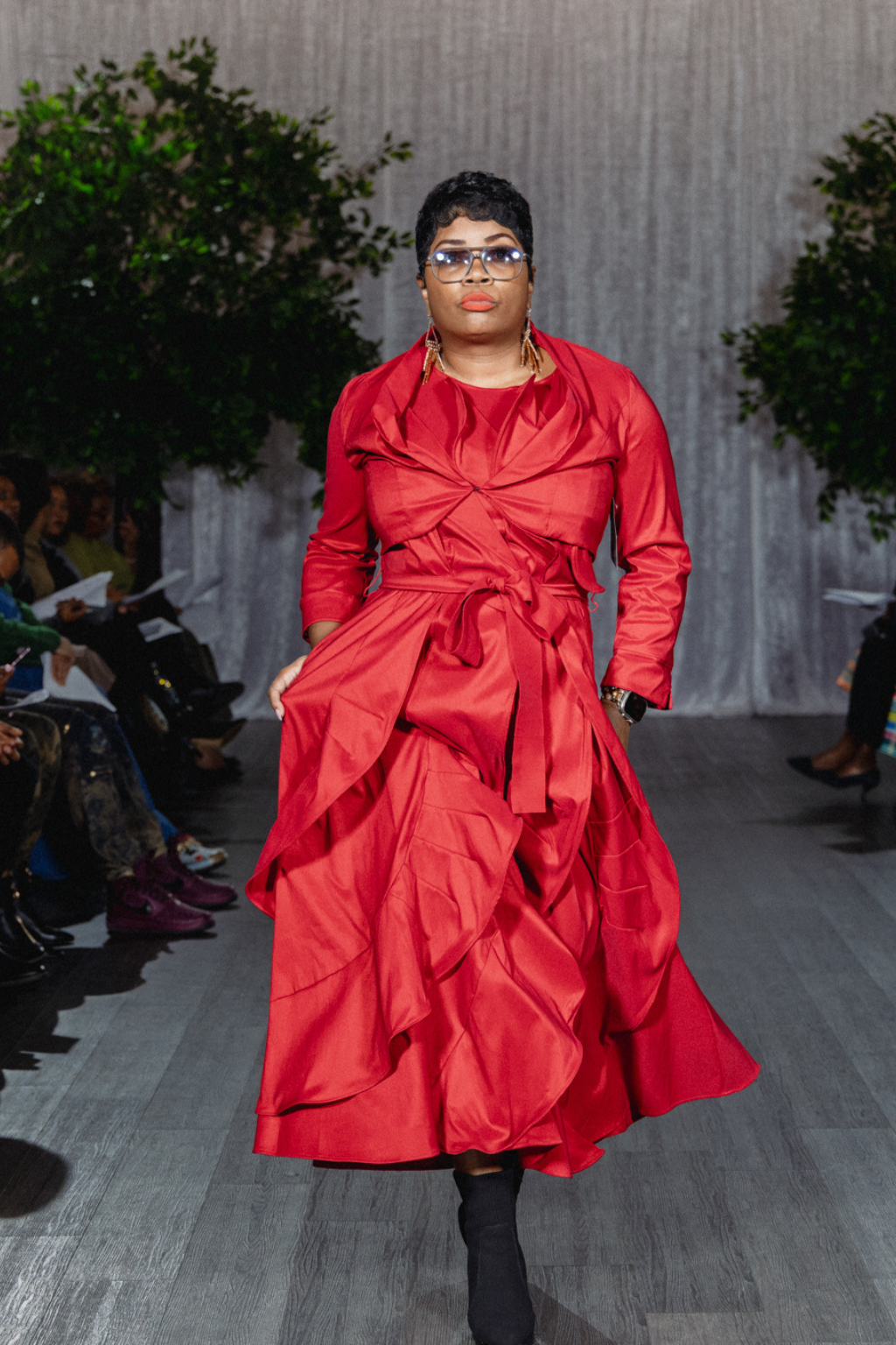 - Features: Cascading ruffles, self belt, sleeveless cut, asymmetrical layered hem
