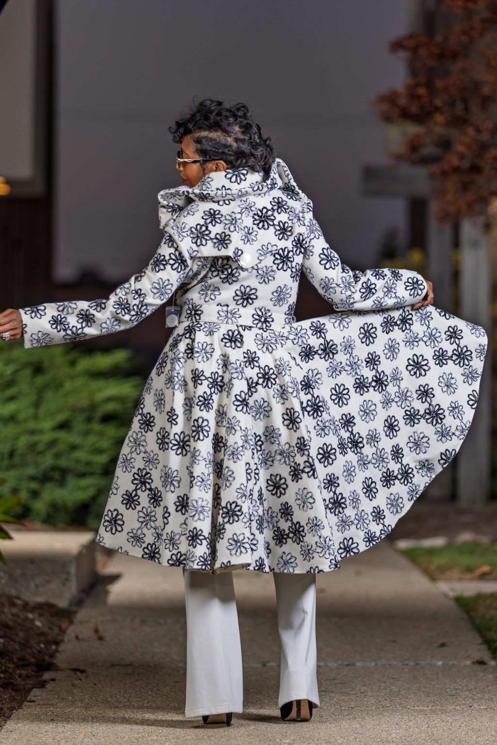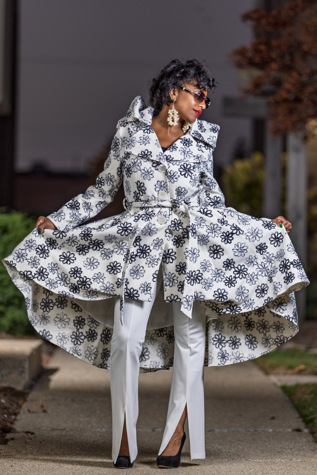 Step into statement style with this heavy high-low coat, where bold florals meet timeless tailoring. Crafted in a creamy base and embroidered with striking black blooms, it flatters with a sculpted waist, dramatic wide collar, and flowing hemline that moves with every step. Oversized buttons add a polished touch, while the textured fabric delivers both warmth and sophistication. A show-stopping piece that turns chilly days into runway moments.