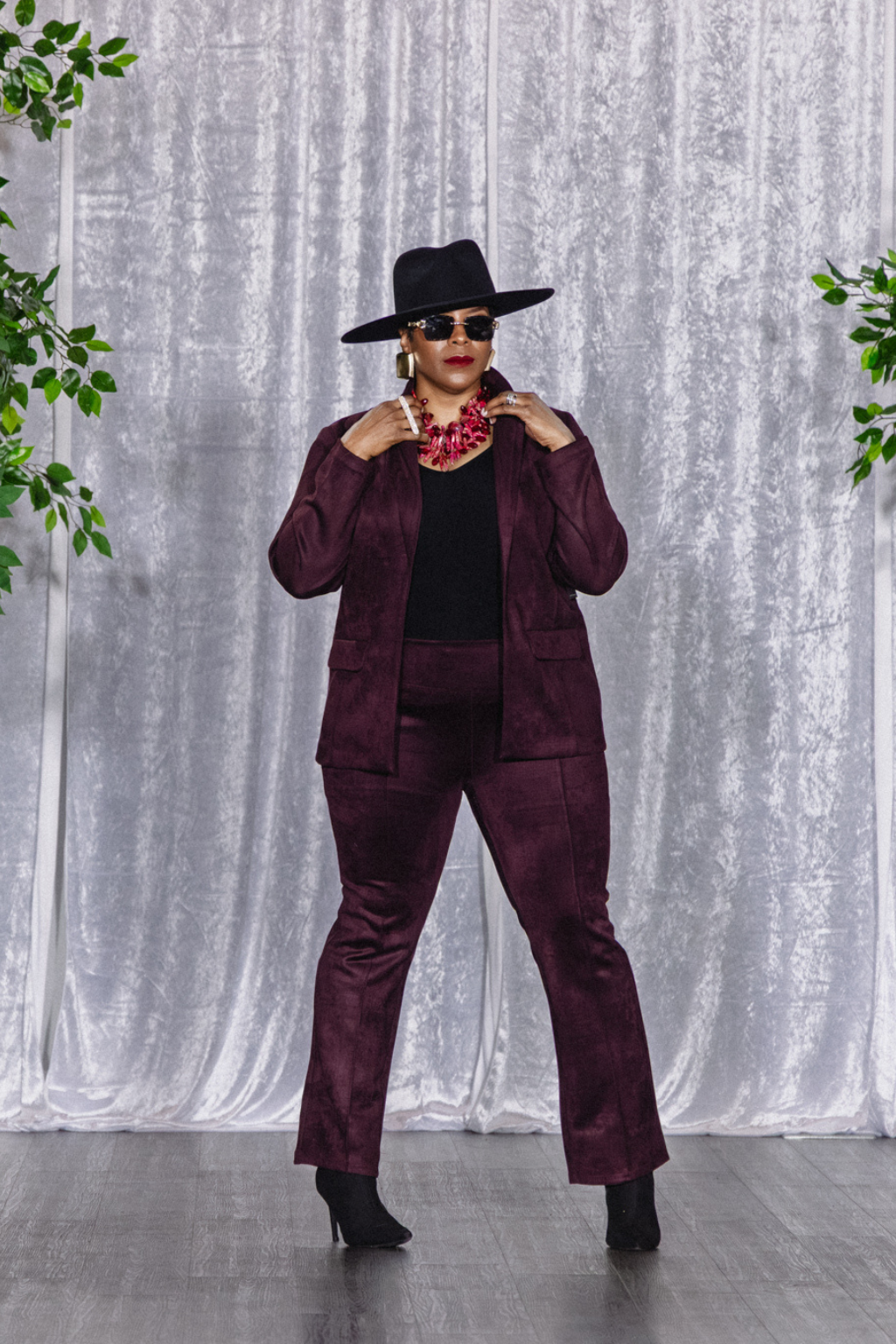 Command the room in the Bordeaux Authority Set — a power move in plush oxblood. This luxe two-piece ensemble pairs a tailored longline blazer with sleek straight-leg pants, cut from a supple faux-suede stretch that moves with confidence.