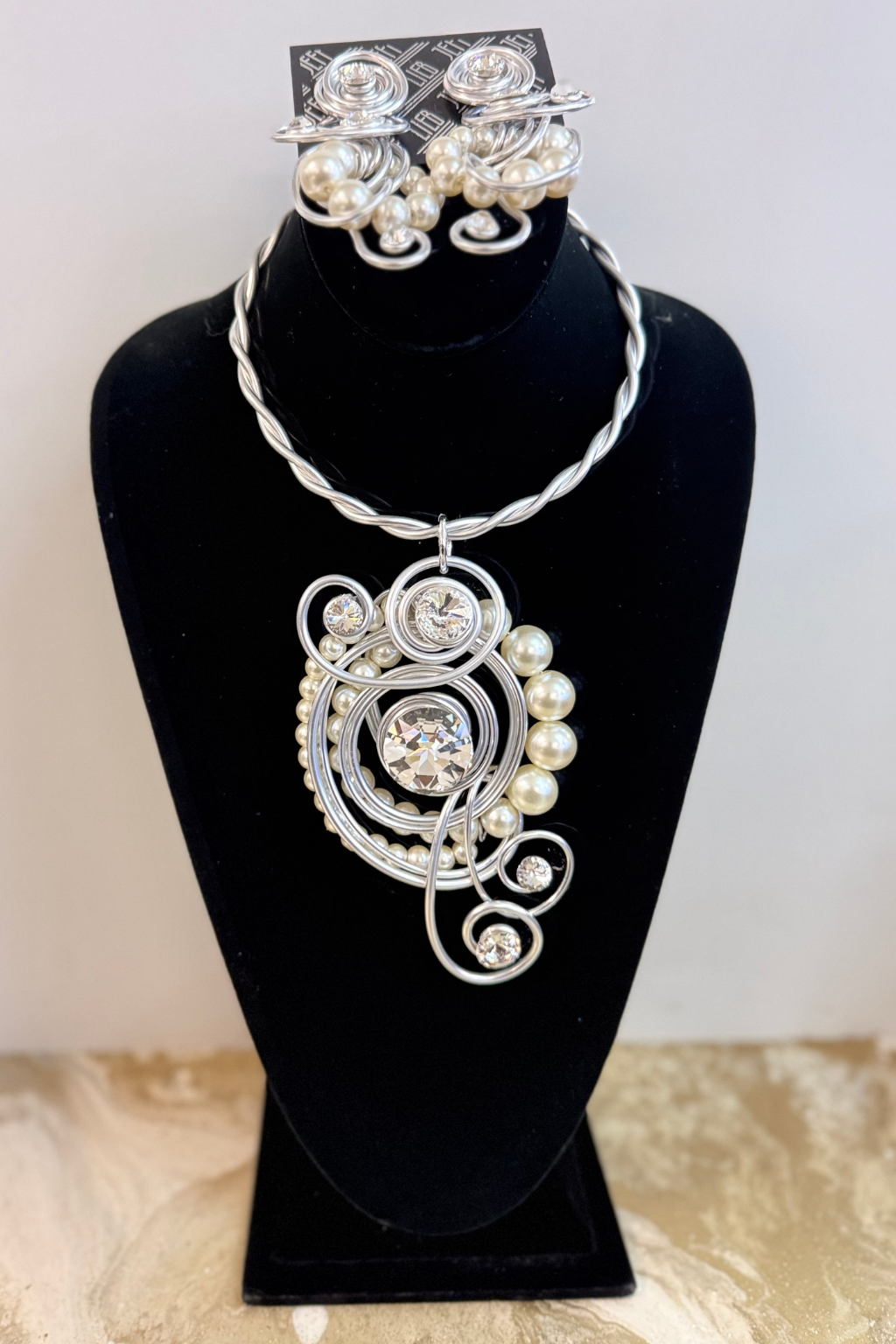 Handcrafted with artistic flair, the Celestial Symphony Set makes a powerful statement of elegance. The bold pendant is a swirling masterpiece of polished silver wire, shimmering crystals, and luminous pearls—capturing the perfect harmony of light and movement. Paired with matching clip-on earrings designed in the same sculptural swirl, this set delivers drama and sophistication without sacrificing comfort.