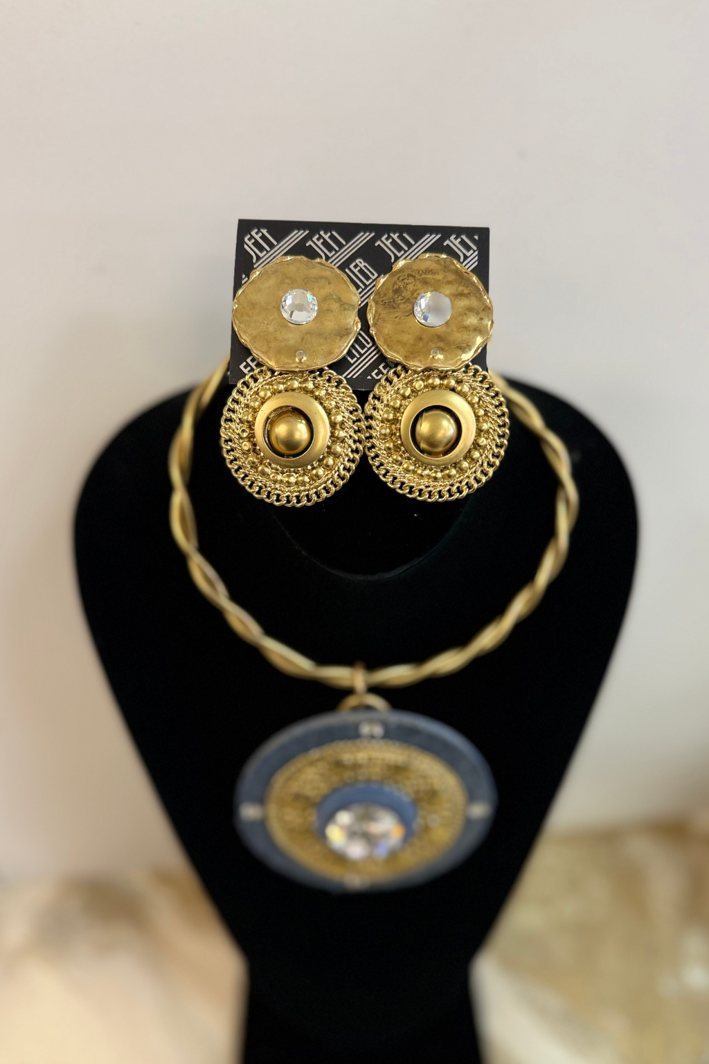 A twisted gold collar sets the stage, sculptural and sleek, leading to a dramatic circular medallion that steals the spotlight. Layers of denim, textured gold beading, and smoky crystal accents frame a brilliant oversized center stone that sparkles with unmistakable authority. Every detail is hand-crafted, dimensional, and unapologetically luxe — classic Jeff Lieb.